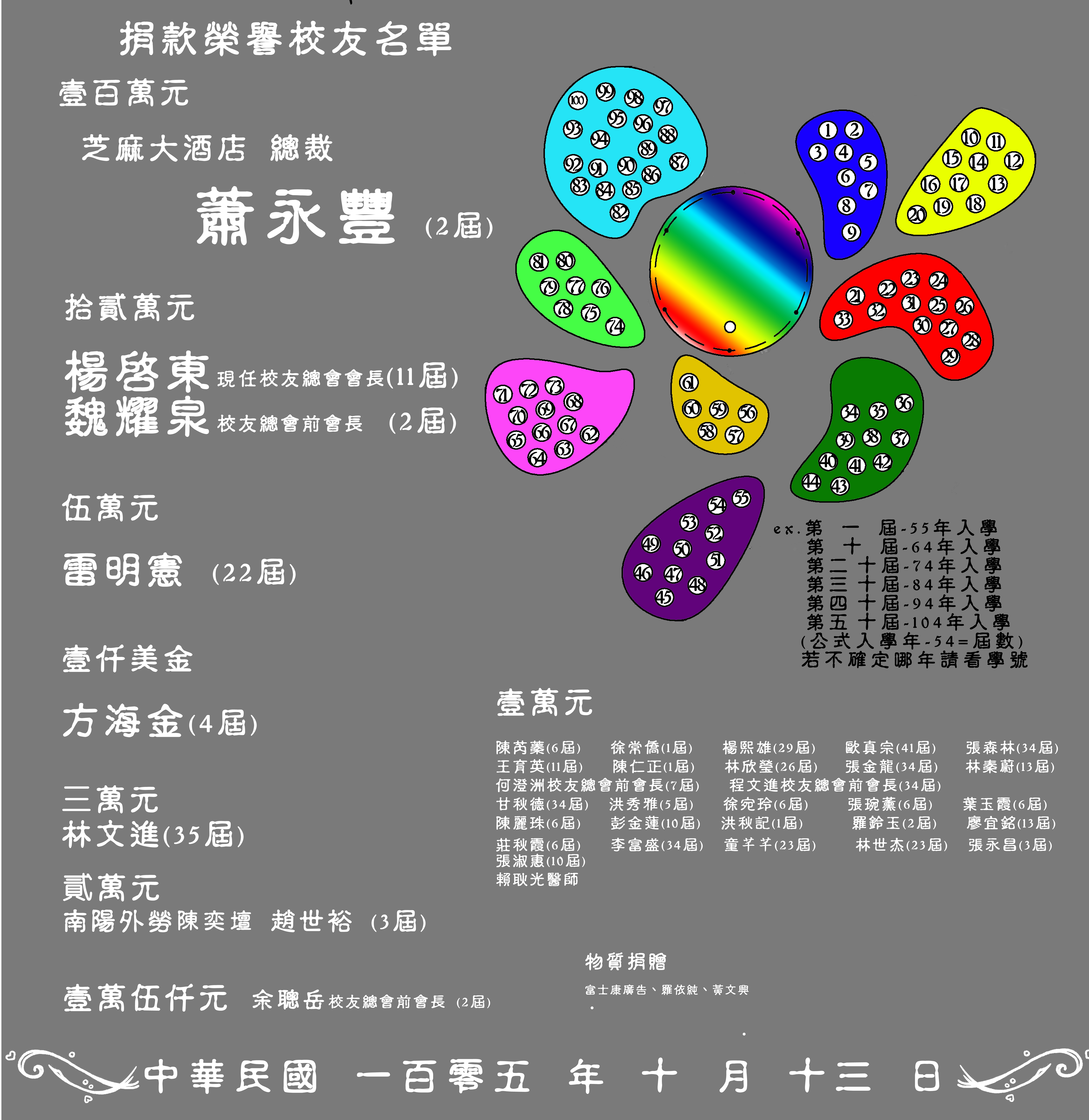 | 2022/05/26 | 校友會立案後第一屆捐款名冊及歷史 第一屆 何澄洲88.~90.7.15 | |